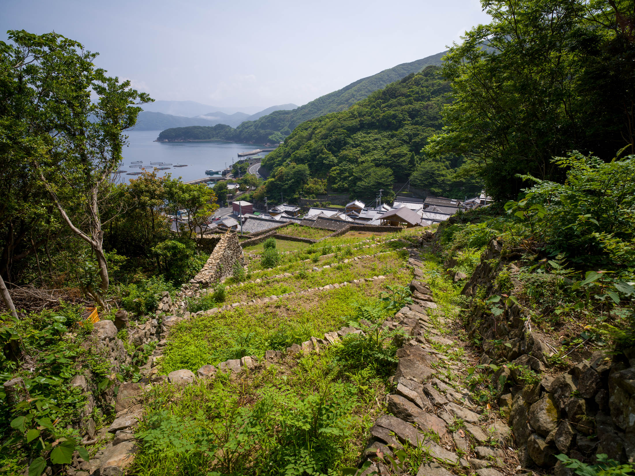 A serene coastal village nestled amidst towering evergreen forests, with a winding path leading through lush foliage to traditional tiled-roof buildings overlooking a tranquil bay surrounded by mist-shrouded mountains.