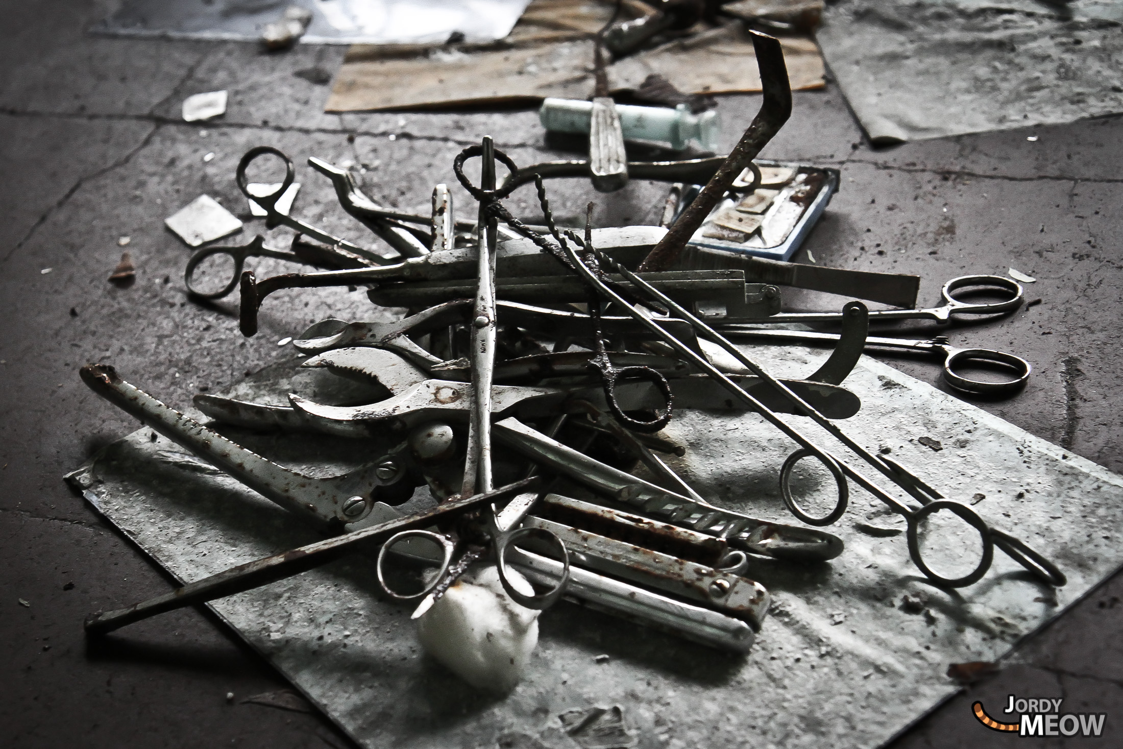 Eerie scene of abandoned tools in rusted Nichitsu Ghost Town, Japan.