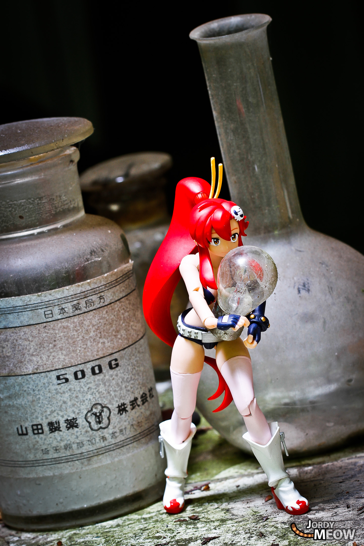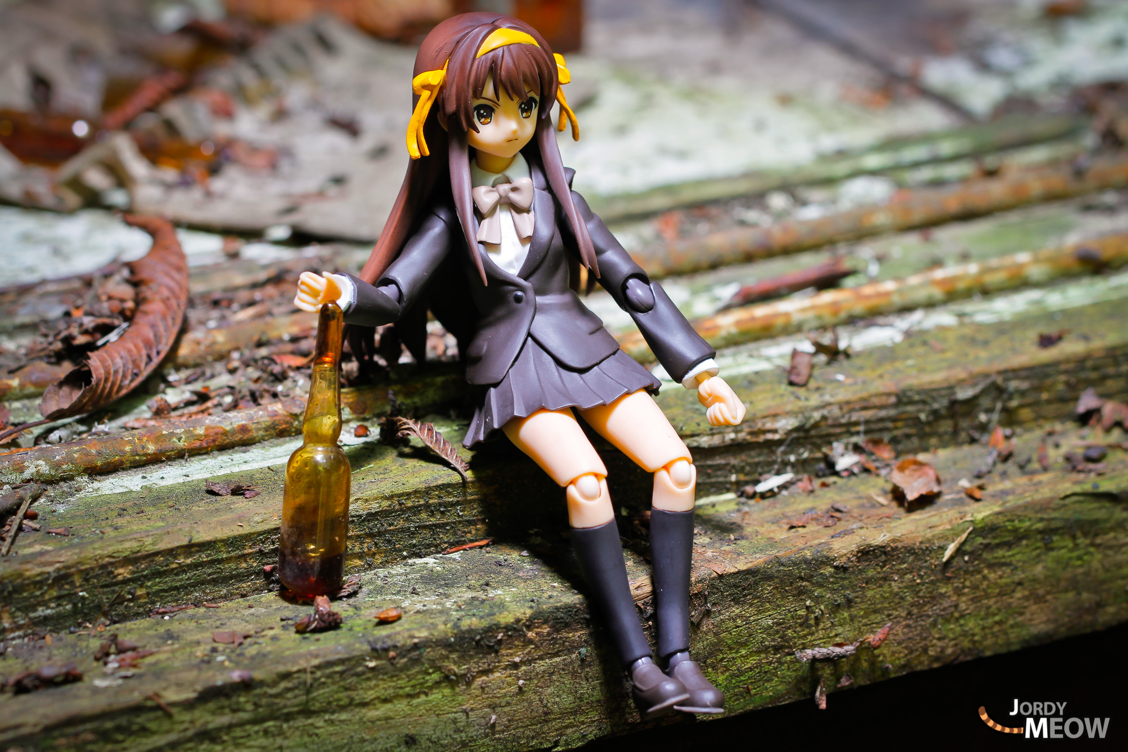Discover the eerie charm of Nichitsu Ghost Town in Japan, with a vibrant anime figurine standing among the ruins.