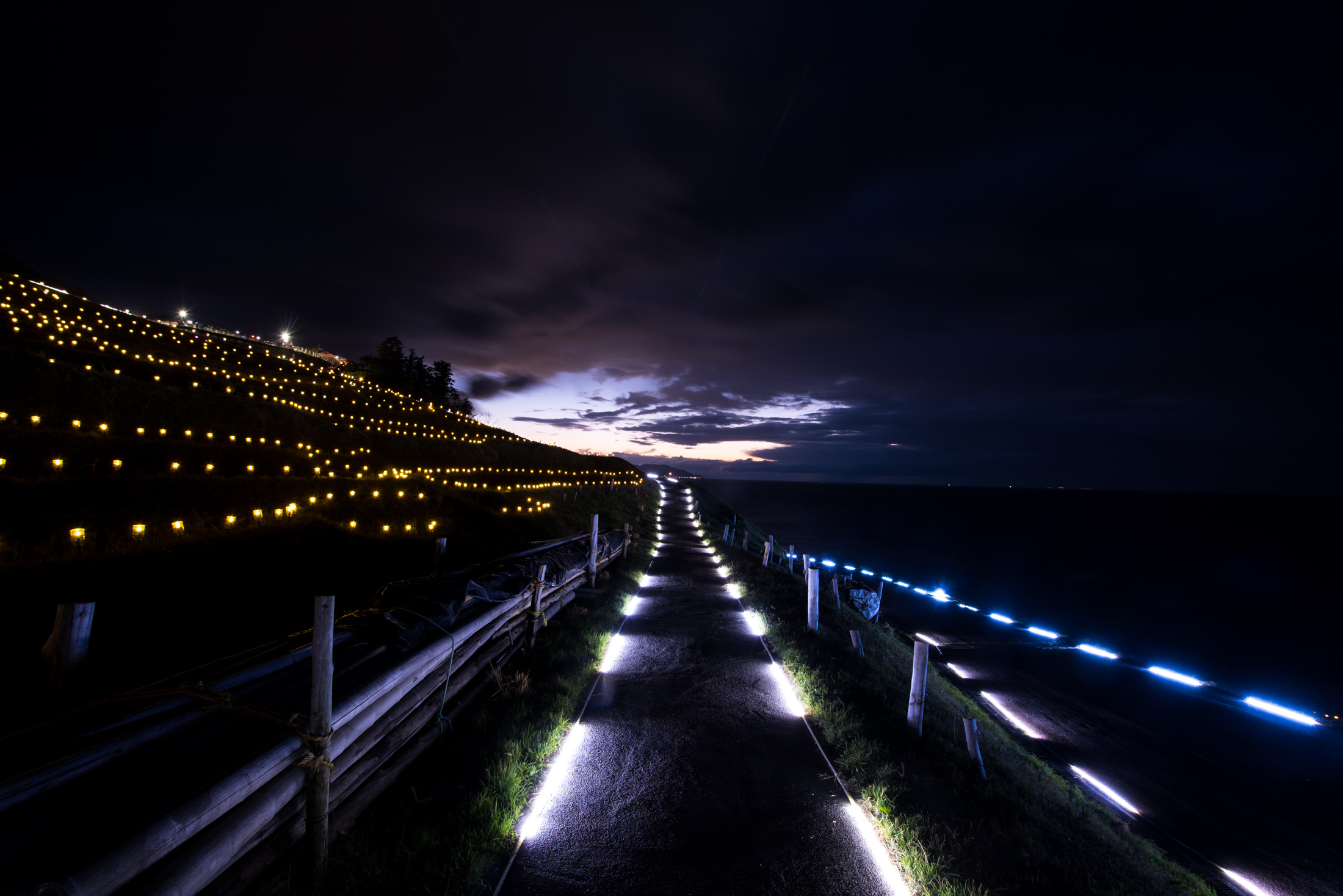 Stunning illuminated rice terraces overlooking the sea in Japan.