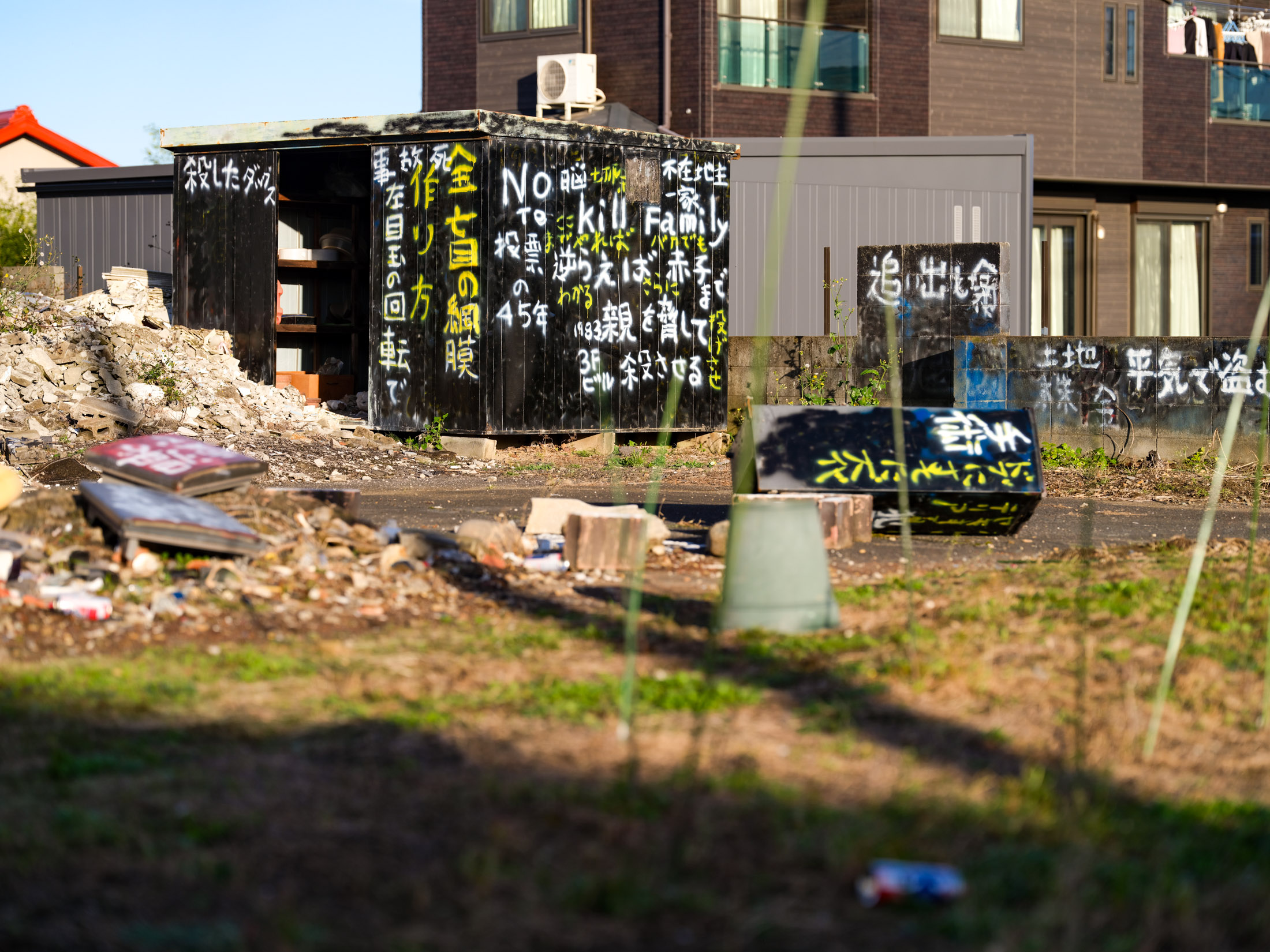 Graffiti-covered black protest shack on a debris-strewn lot, starkly contrasted with modern apartment buildings behind it.