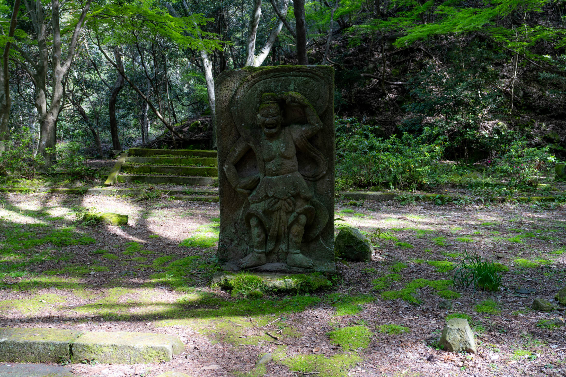 Ancient stone Buddha relief in a mossy forest clearing at Kyu-Sento-ji temple ruins.