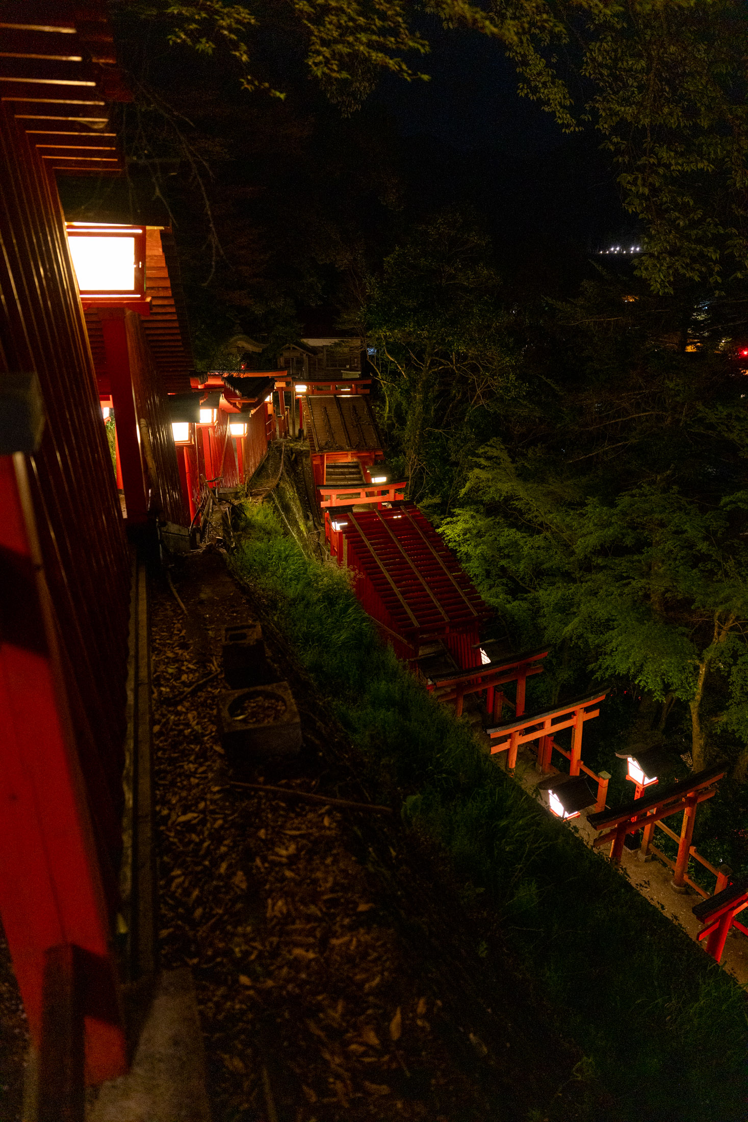 Lantern-lit torii gate staircase descends through the forest at Taikodani Inari-jinja Shrine in Japan at night.