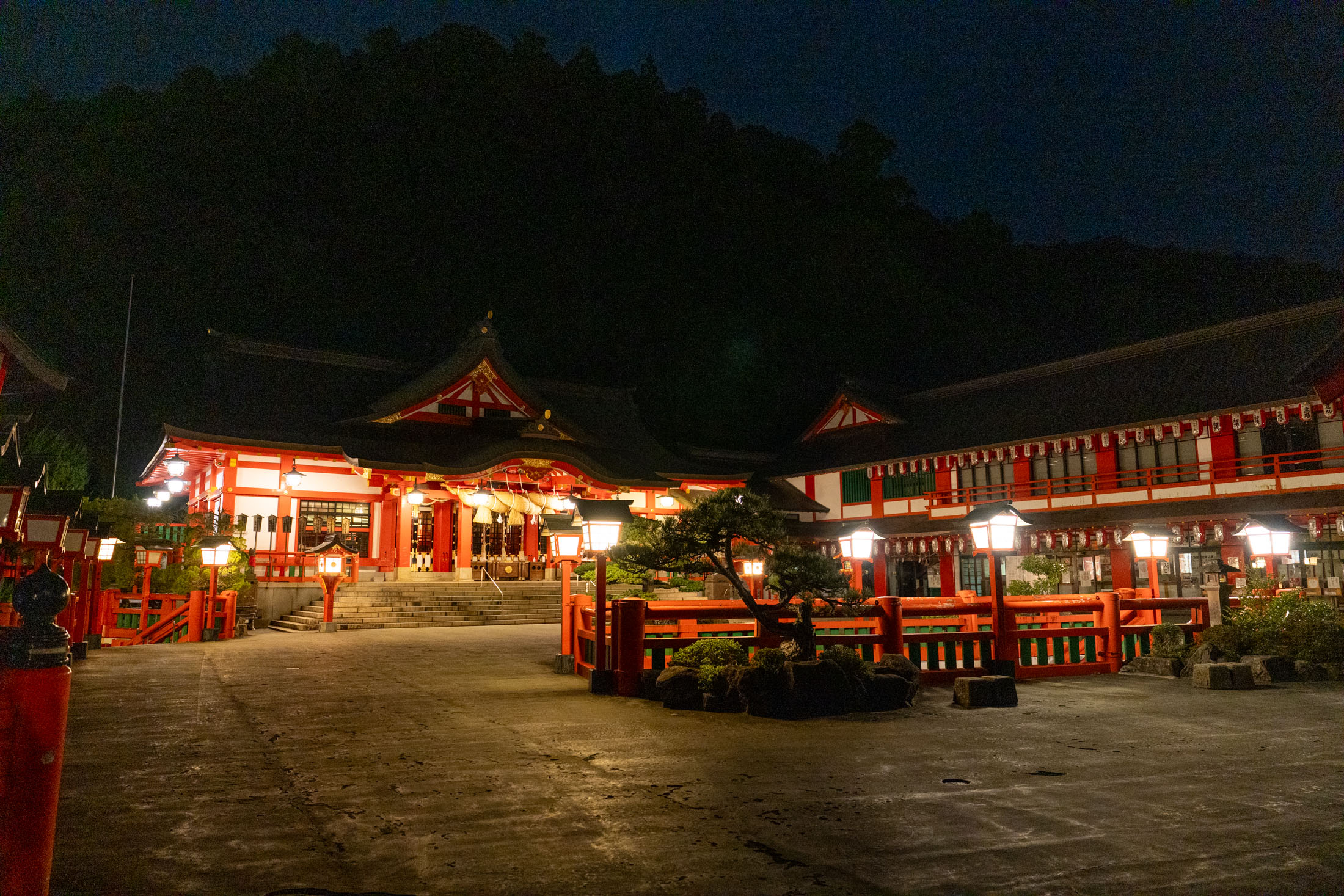 Taikodani Inari-jinja Shrine glows at night, with vermilion halls, stone steps, and lanterns illuminating the quiet courtyard.