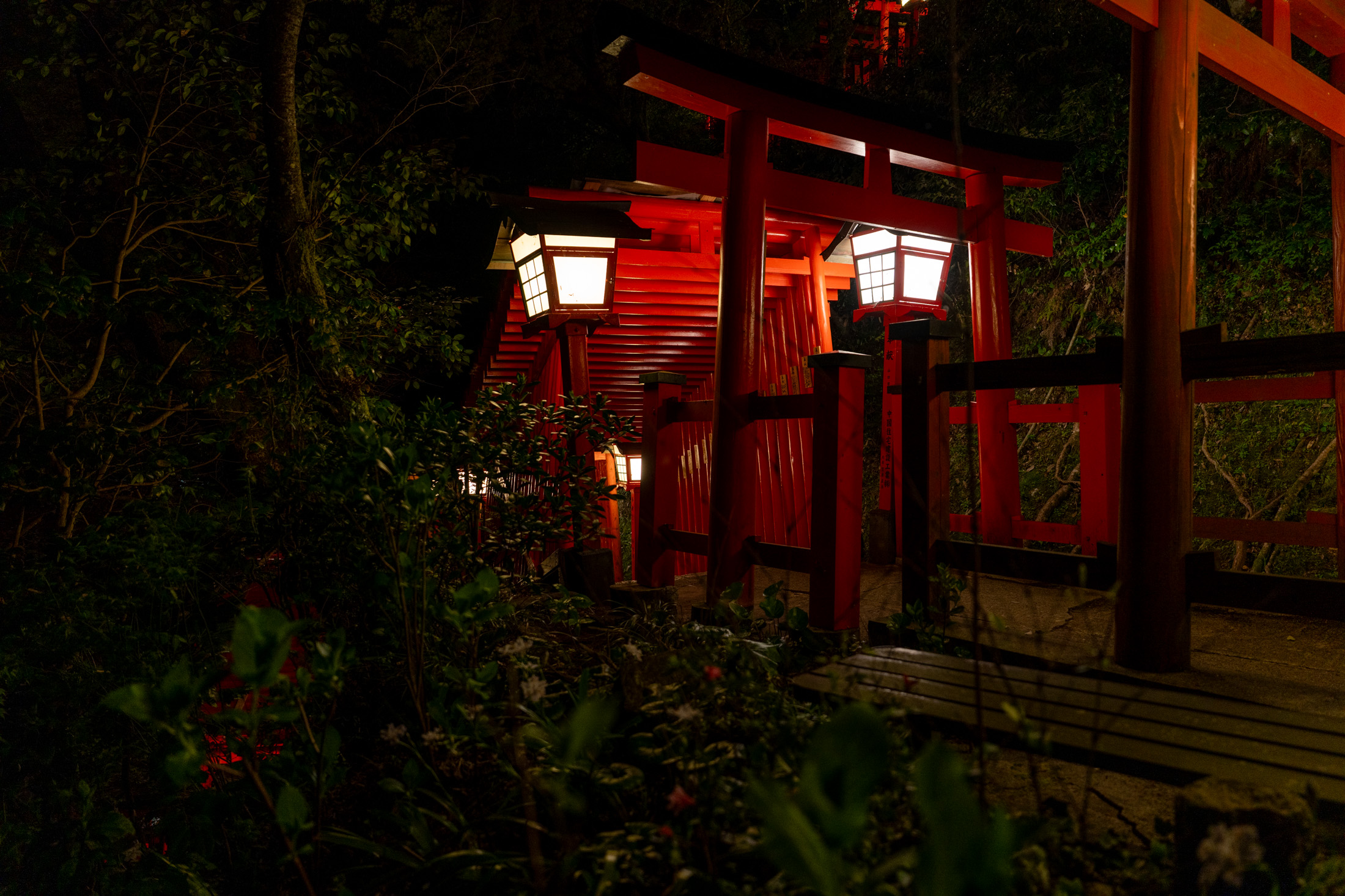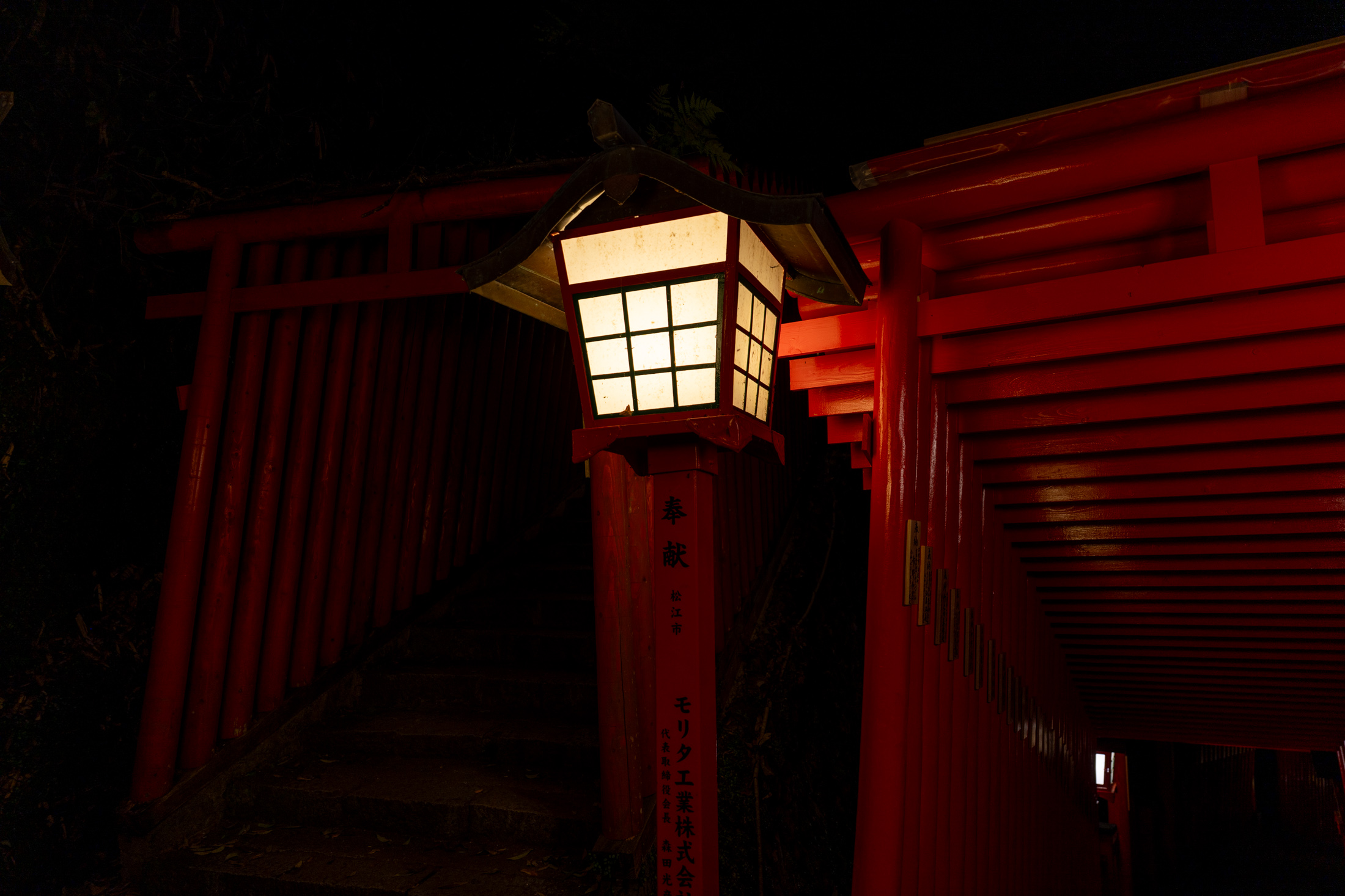 Lantern-lit vermilion torii gates form a quiet nighttime tunnel at Taikodani Inari-jinja Shrine in Japan.