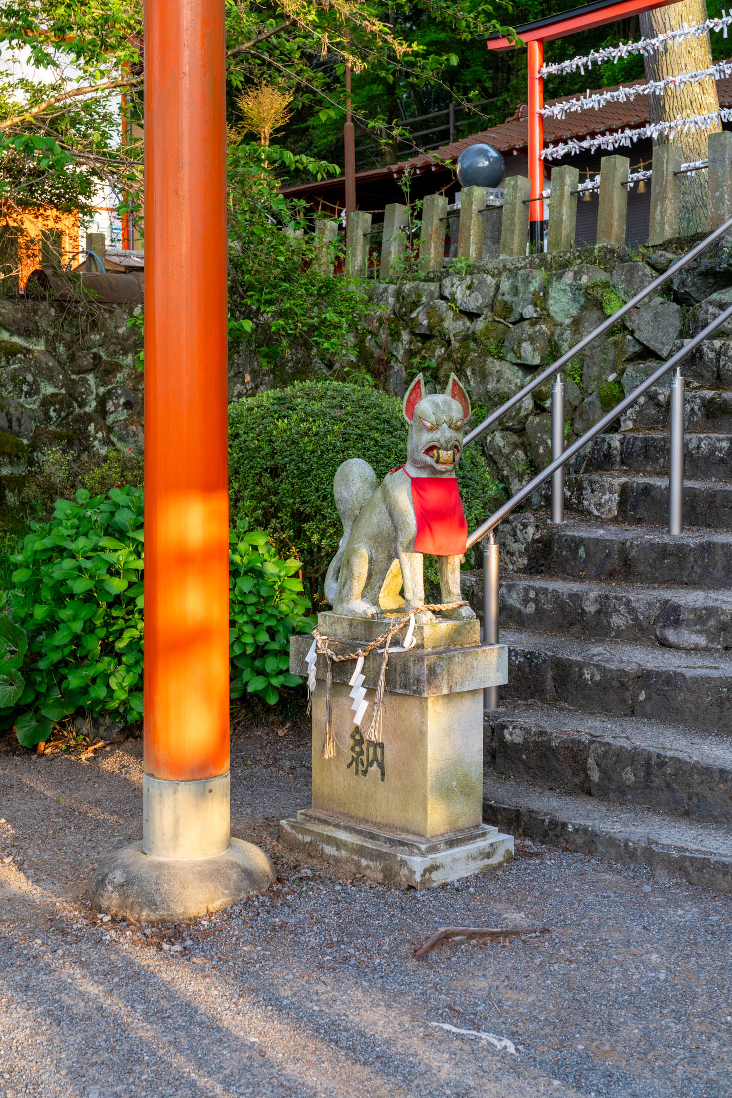 Fox statue with a red bib beside a vermilion torii at Ukiha Inari Shrine, overlooking stone steps lined with omikuji fortune slips.