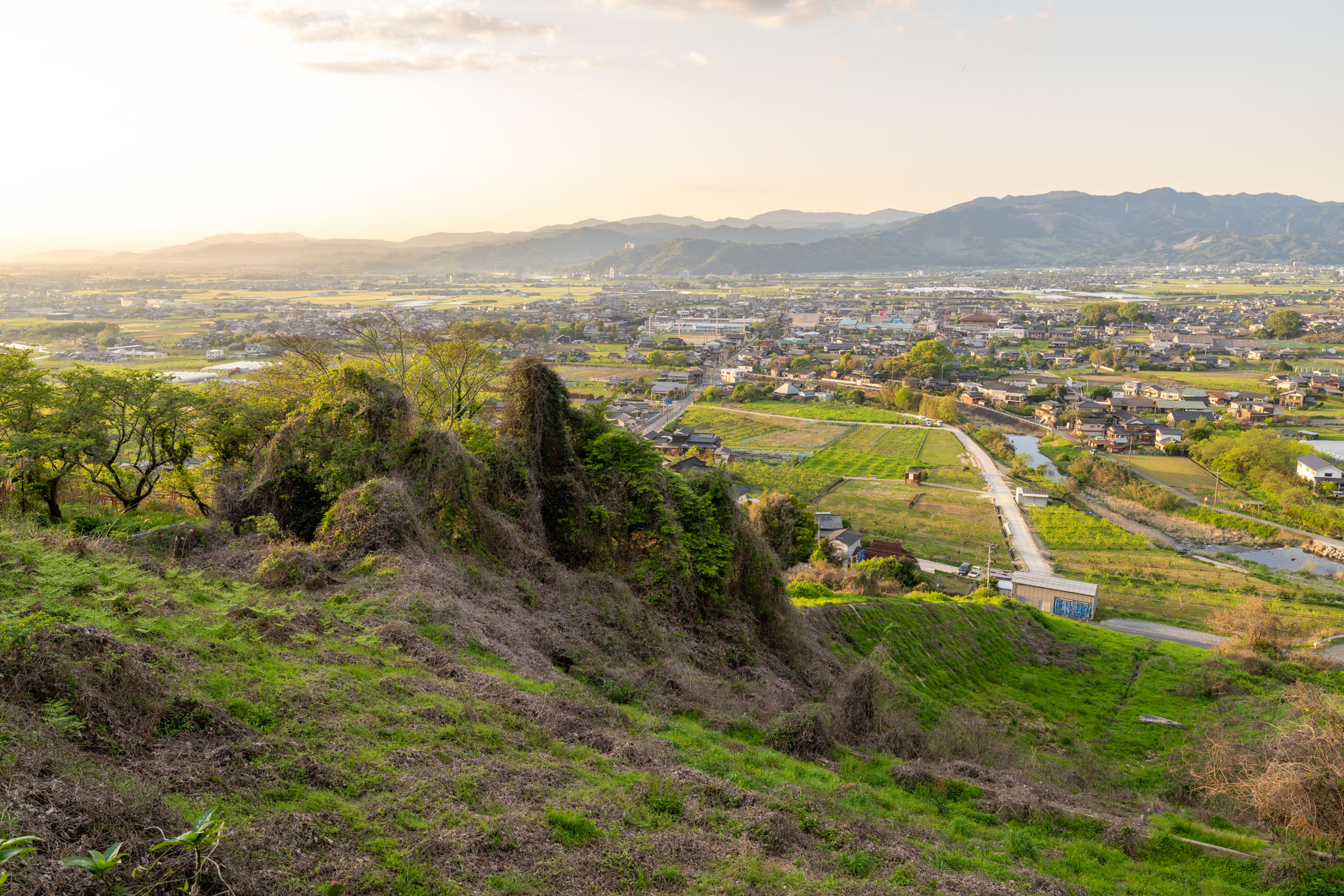 Sunset view from Ukiha Inari Shrine overlooking rural Japan’s valley fields, winding river, and distant mountains.