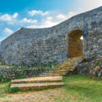 A curious stray cat explores an overgrown urban landscape with a weathered stone wall surrounded by lush vegetation.