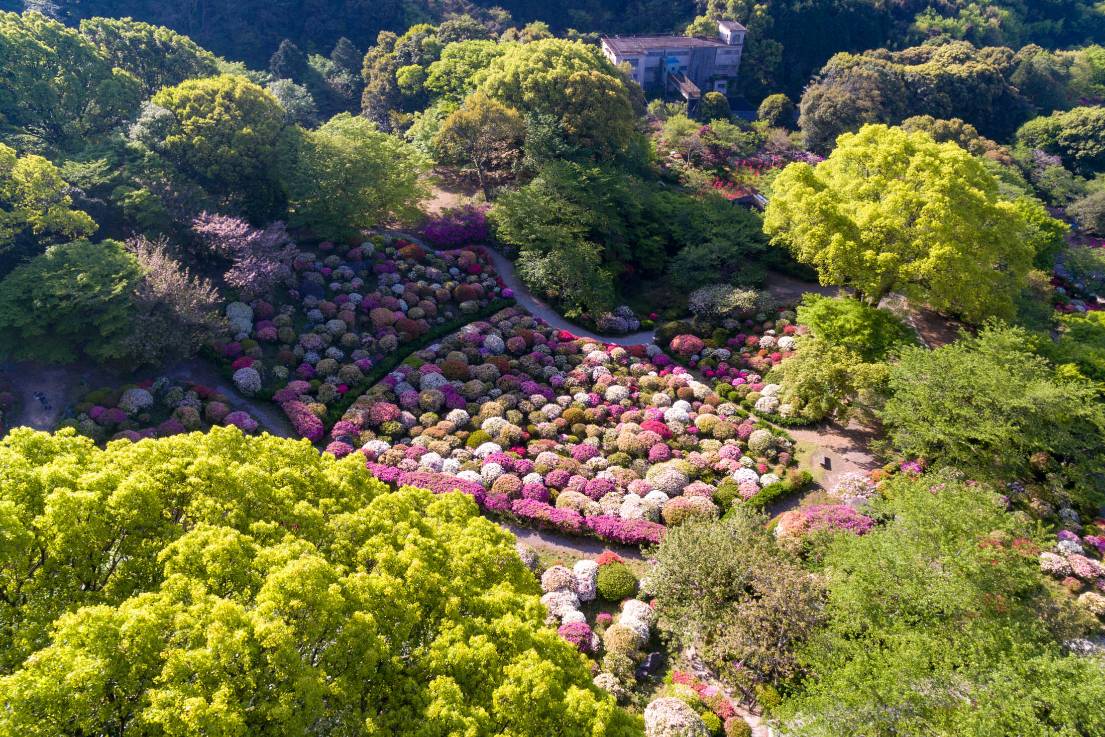 A breathtaking aerial view of vibrant Mifuneyama Park showcasing lush cherry blossoms and winding paths.