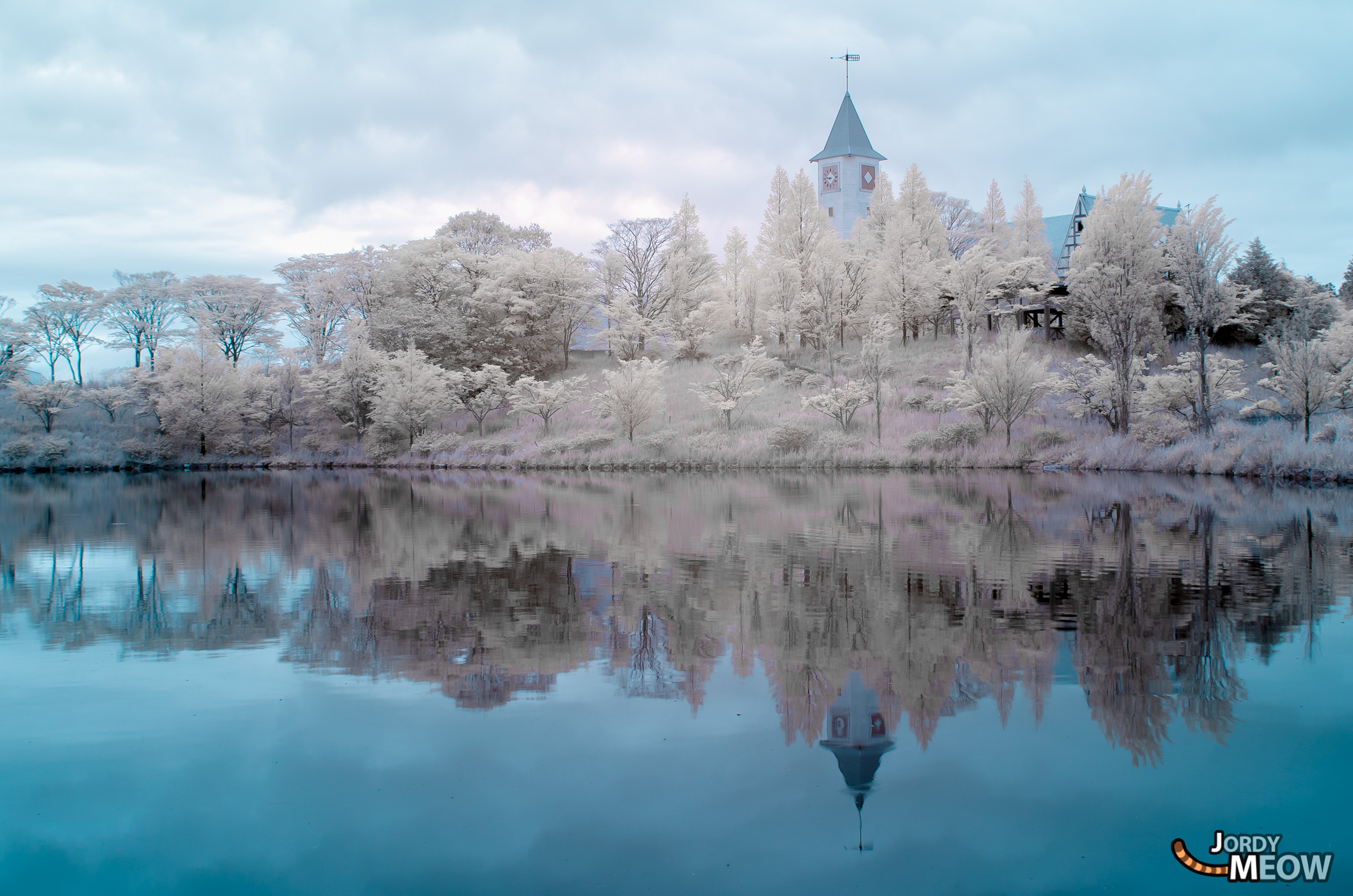 A serene winter scene of an abandoned Japanese theme park, with a castle-like structure reflected in a frost-covered lake.