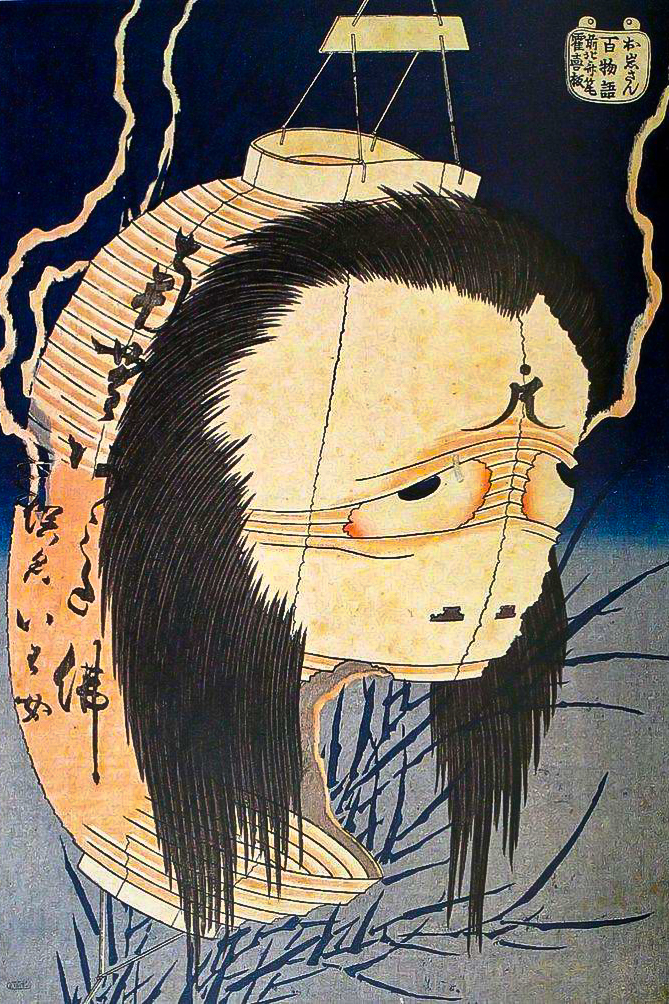 A serene ghostly spirit surrounded by an eerie glow sits under a traditional paper lantern in a lush Japanese landscape.