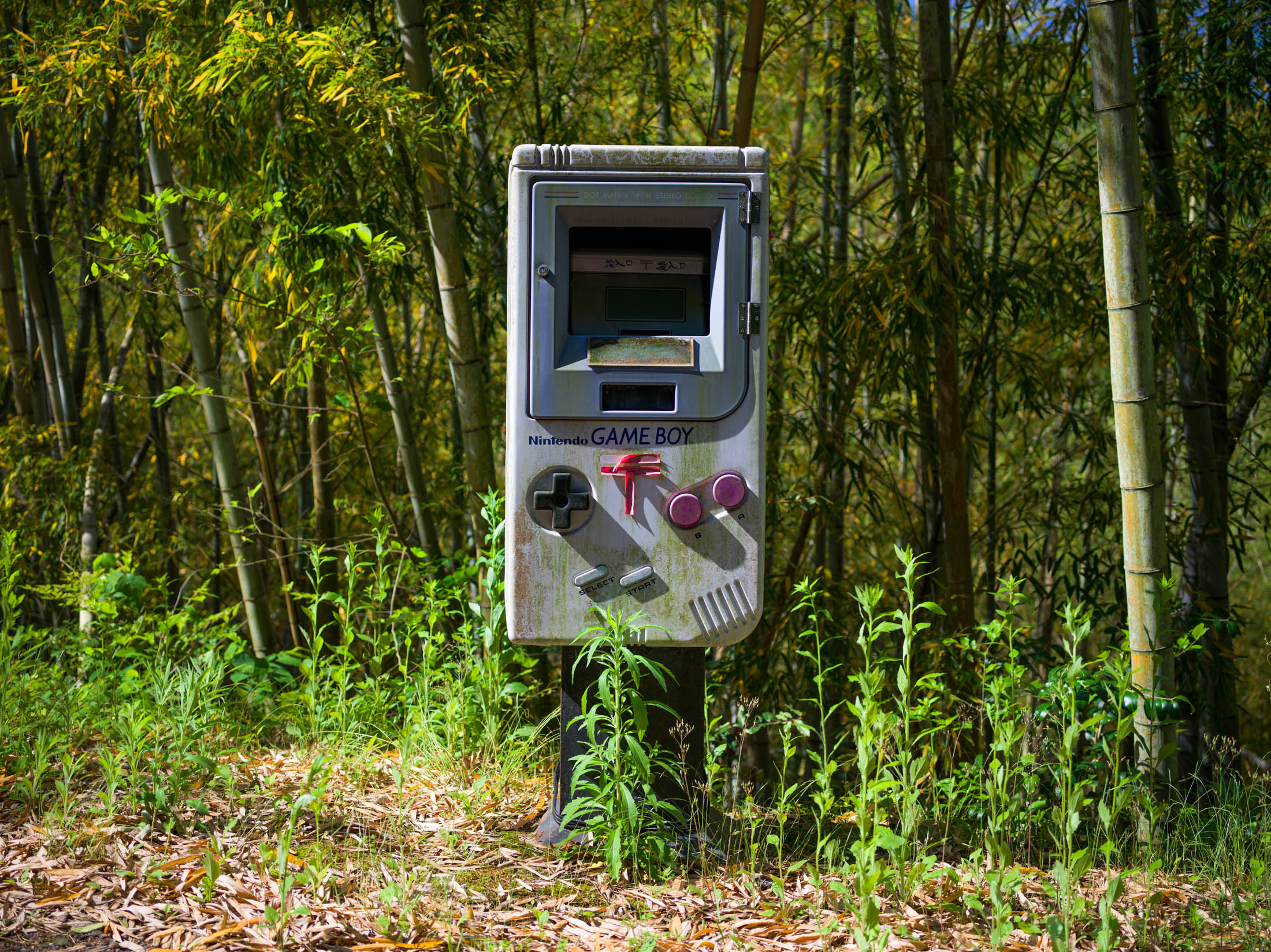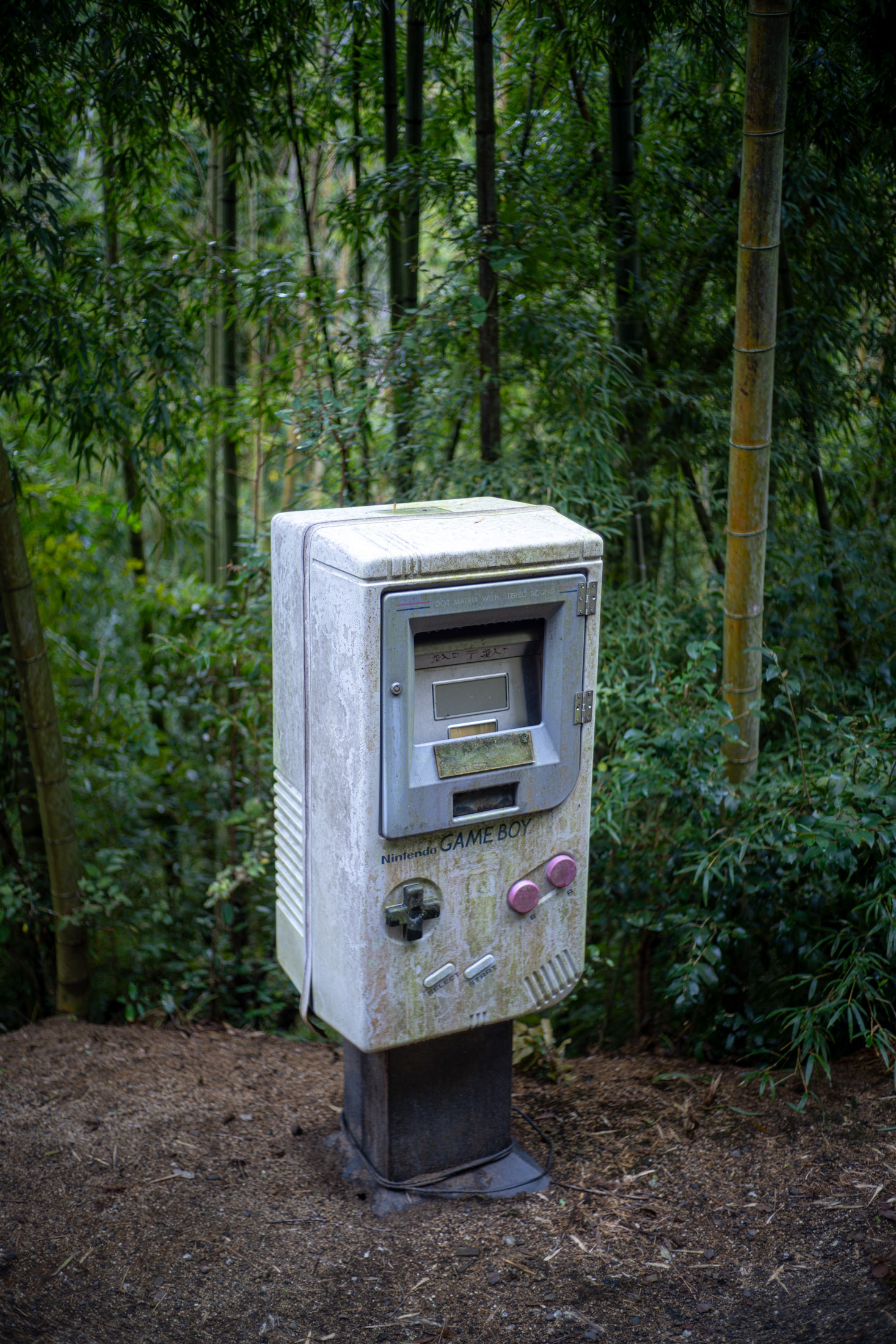 Giant Game Boy-shaped mailbox on a post in a bamboo forest, with a mail slot where the screen would be.