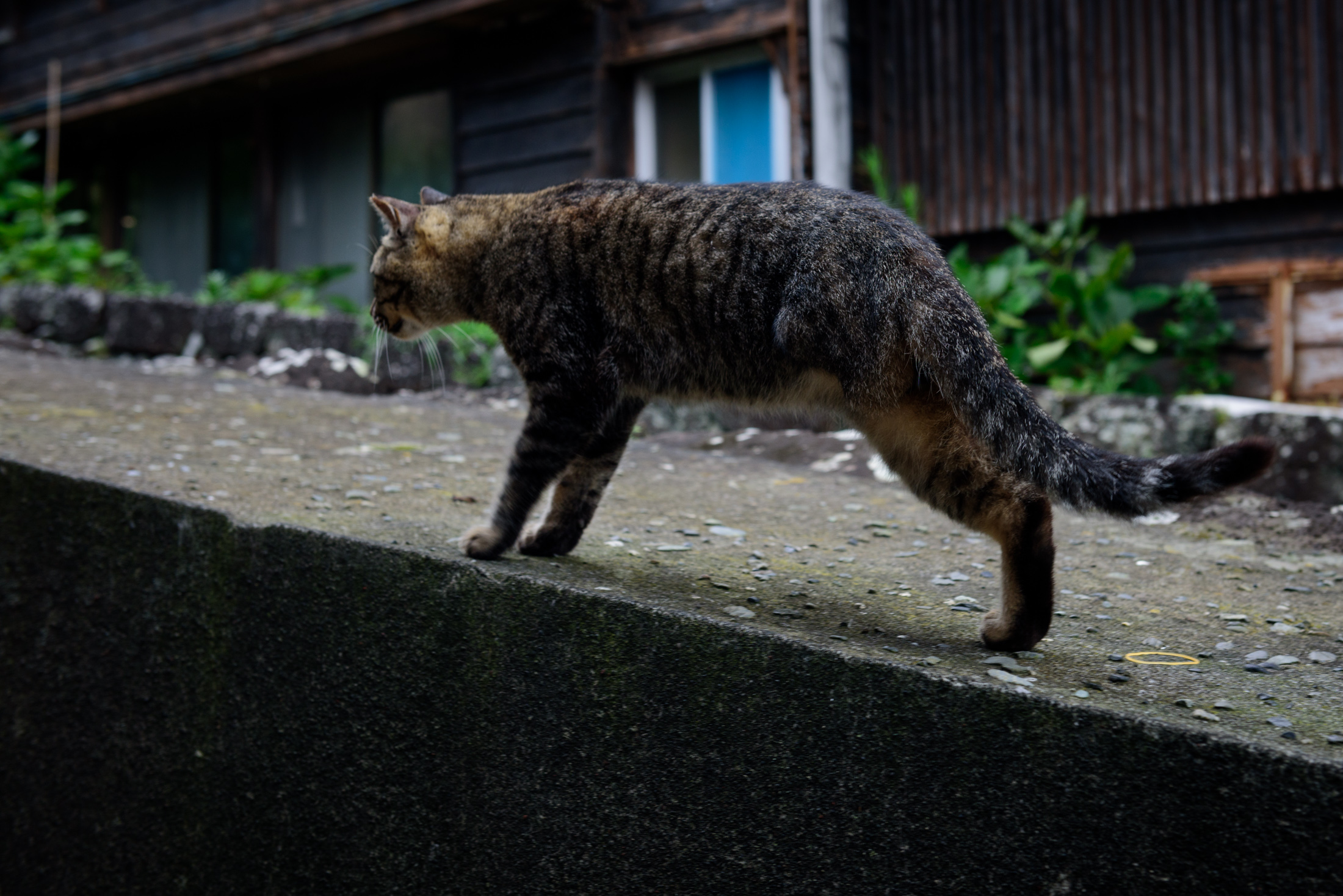 Black cat resting on a weathered stone path beside a rock wall on Oshima Island.