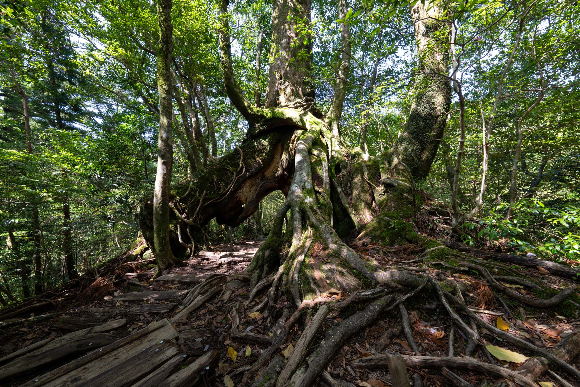 Ancient moss-covered tree and sprawling roots in Shiratani Unsui Gorge, Yakushima, Japan.